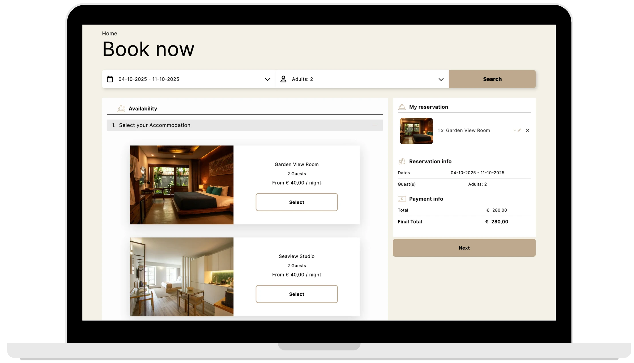 Αυτό σημαίνει ότι μπορείς να διαχειρίζεσαι κρατήσεις, διαθεσιμότητες, τιμές και περιεχόμενο εύκολα — από οποιαδήποτε συσκευή, χωρίς τεχνικές γνώσεις.